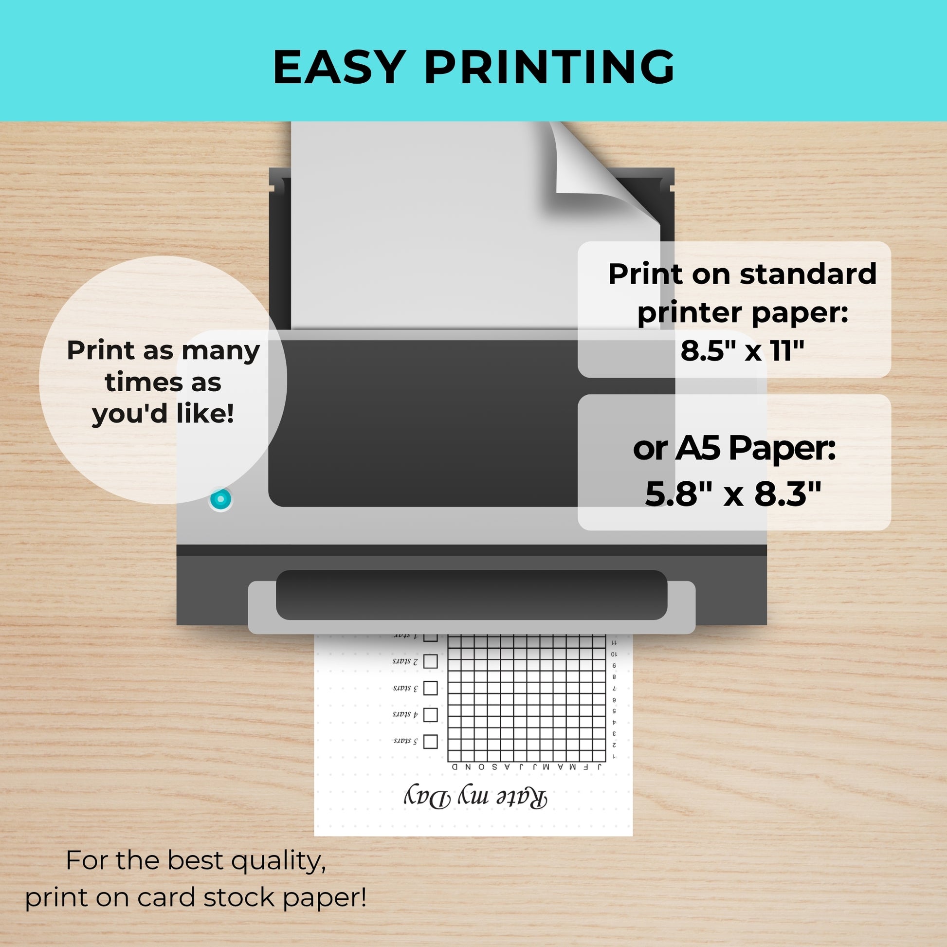 Stay mindful of your emotions and track your daily experiences with this Rate My Day journal page. Rate each day out of 5 stars and get a clear visual overview of your emotional patterns throughout the month or year. Whether you're aiming to boost your happiness, reflect on your mental wellness, or simply enjoy journaling, this mood tracker is the perfect addition to your planner or journal.