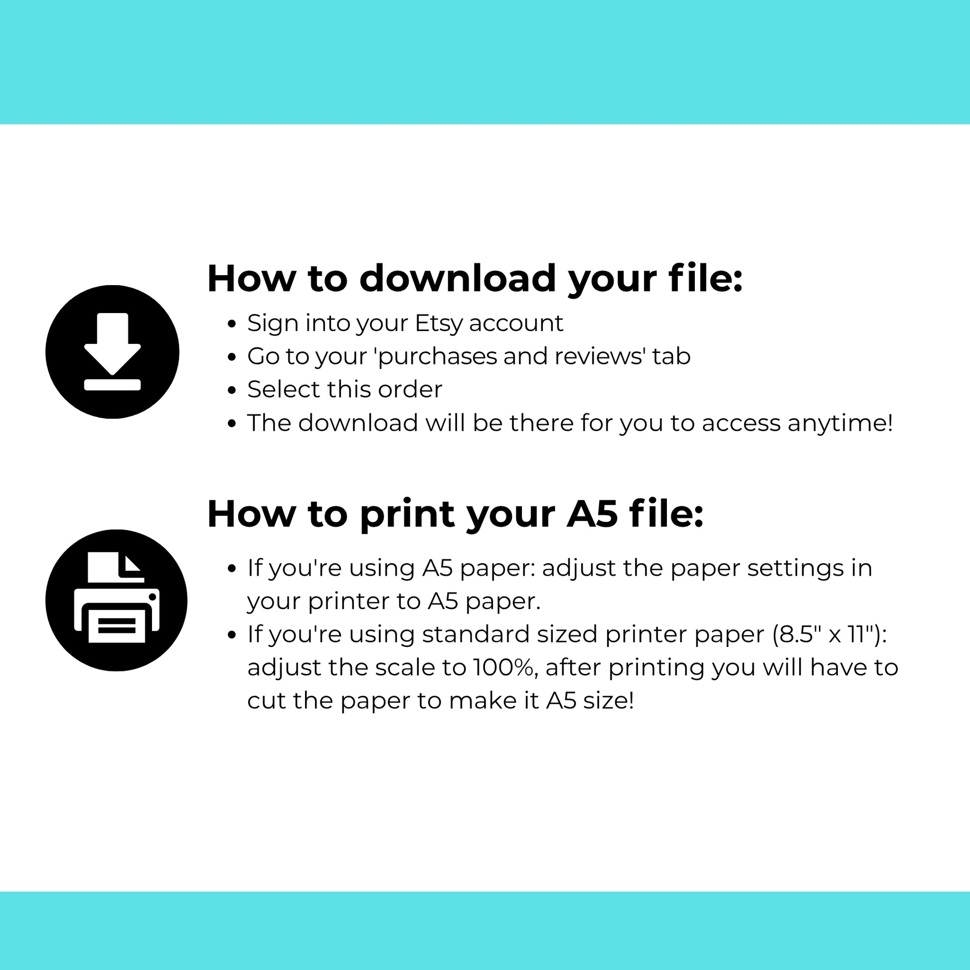 If using standard 8.5" x 11" paper, print at 100% scale and trim to A5 size.